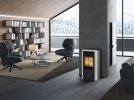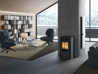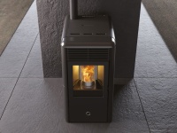 Centrālapkures granulu kamīns ar metāla dekoratīvajiem paneļiem sānos, keramikas virsmu un keramikas dekoratīvajiem elementiem.