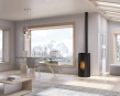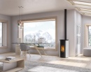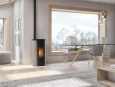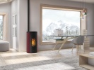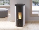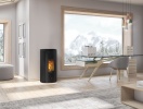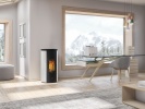 Siltā gaisa granulu kamīns ar vienu ventilatoru. Ieliekti dekoratīvie sānu paneļi (metāla), pieejami dažādās krāsās: balts, bēšs, bordo, melns. *Sānu paneļi pieejami arī ar keramikas materiālu, cenu precizēt pie konsultanta.